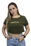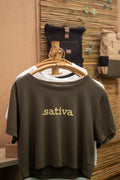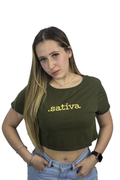 O Cropped .sativa. Chega em verde intenso com o texto amarelo no peito um recado simples, mas impossível de ignorar.
